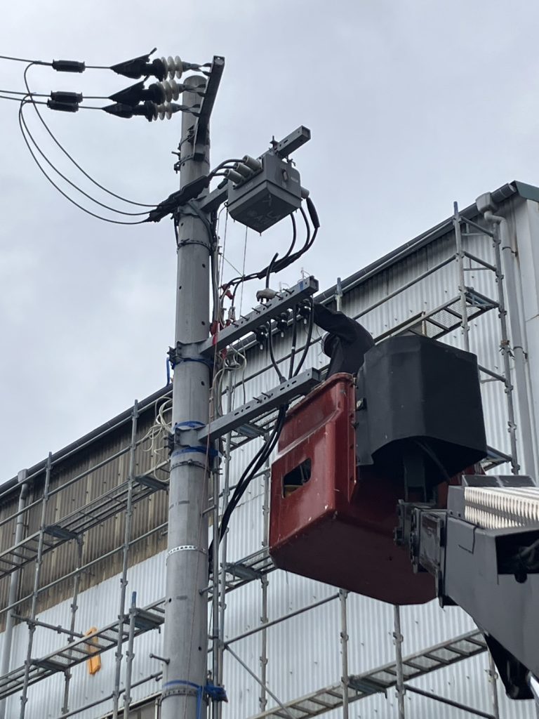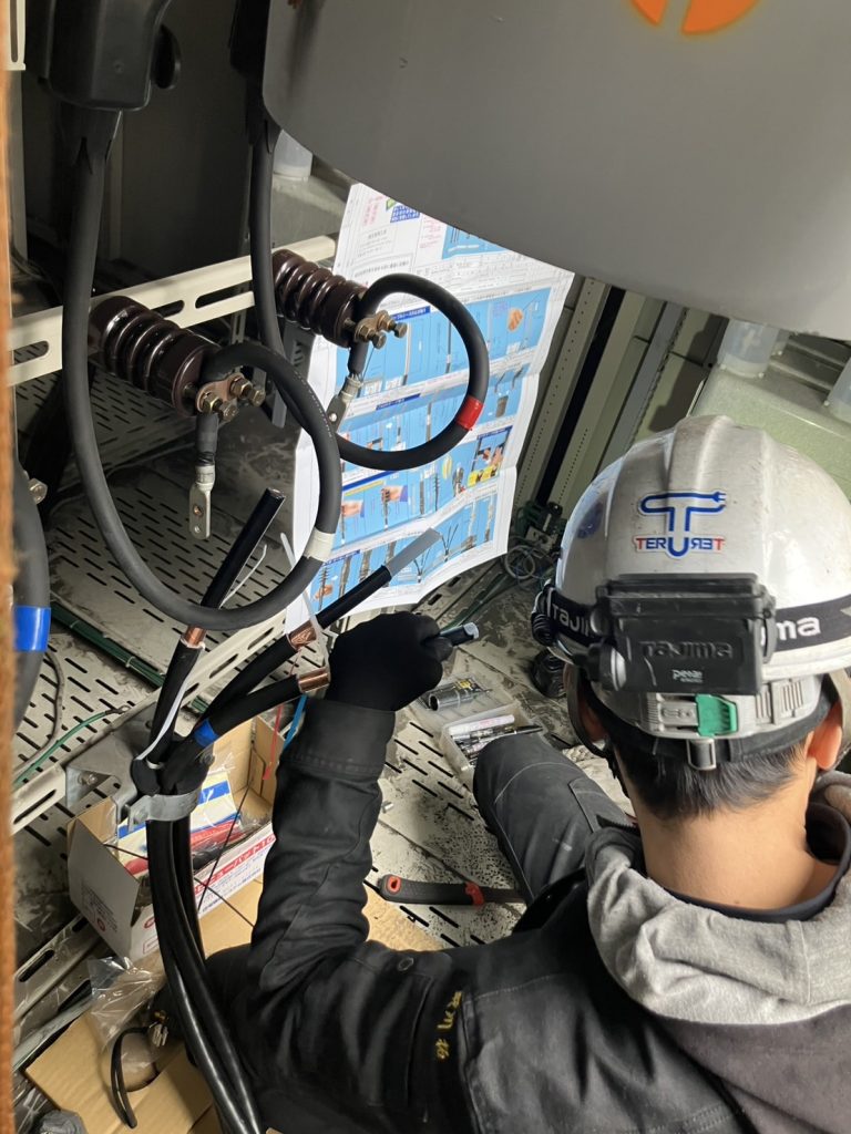2月2日(日)11月の年次点検で、不良の判定をした2016年製注意喚起高圧ケーブルの更新工事です。過去8年間は10000Vでの絶縁抵抗値は100GΩでしたが、9年目には8000Vで1GΩと急激な絶縁抵抗値の劣化がみられました。その後メーカーに連絡を取り予防保全申込書を送り、対応をしていただきました。そして工事の日です、耐圧試験の写真を取るつもりが、業務に集中したあまり、写真を撮るのを忘れ工事中の写真のみです。工事はさすがプロフェッショナルです。かなりの経験の積み重ねがあるようで安心しておまかせできました。ケーブルも(EE)に変わったので私がこの仕事をしている間は安心です。