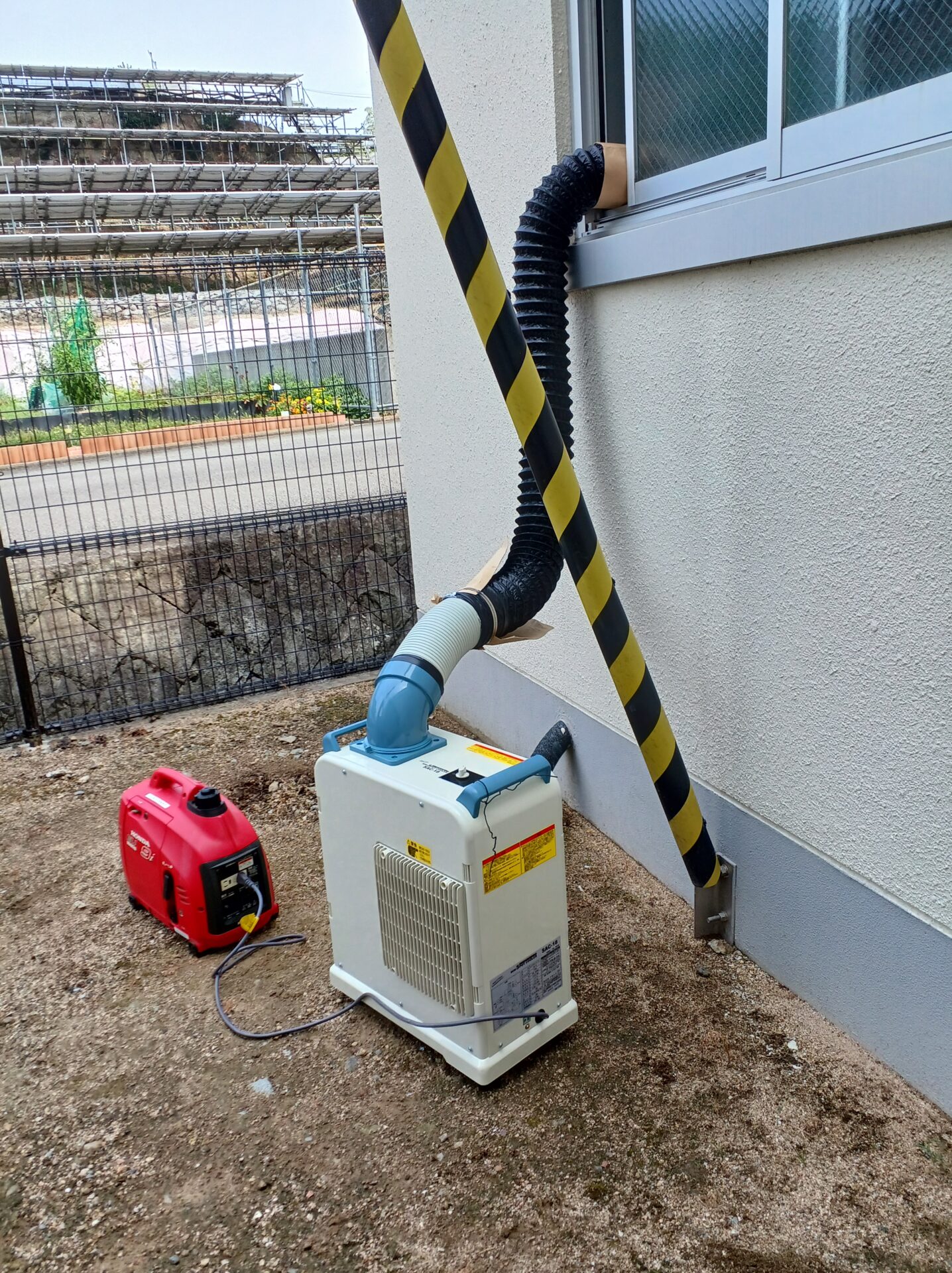 学校が夏休みに入ると、幼稚園、小学校、中学校の年次点検が始まります。毎年恒例ですが、年々暑くなっているようで、今年は熱中症対策にスポットクーラーを導入しました。 もともと空調服は好みではないので、夏用のメッシュの作業服で点検作業をしていますが、スポットクーラーの導入はなくてはならないものになりました。 電気室全体は快適な温度まではならないものの、熱くなった体を直接冷やせるうえ、温度、湿度ともにいくらか下がるので作業効率が上がります。写真では窓の上側はあいてますが、塞いで締め切った方が効果があります。当社の学校施設の点検は電気室と外部分電盤の2チームにでやりますが。スポットクーラーの導入により電気室作業担当の方がよく思えるようになりました。