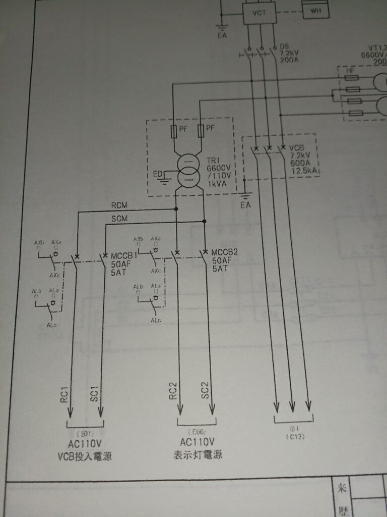 次にOCRとVCBの連動がなぜできなかったかの調査です。シーケンスを確認したところVCB投入電源RC1、SC1に電圧がないと動かない回路となっています。またDGR、OCR、UVR、3つの継電器の動作でVCBを遮断する回路になっています。(見えにくいですが、下の写真の母線はRC1、SC1でVTの100v電源です。)