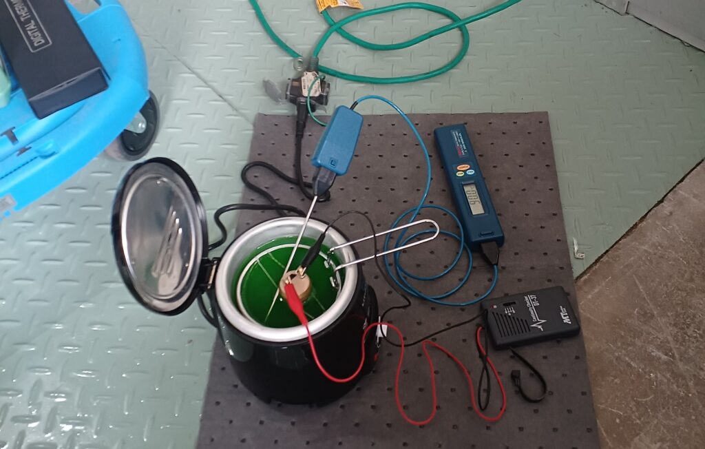 下の点検はいったい何をしてるのか、非常用発電機の冷却水温度異常の動作値試験だそうです。実機で110度まで温度をあげるわけにいかないので、外して測定するそうです。初めて見ました。
